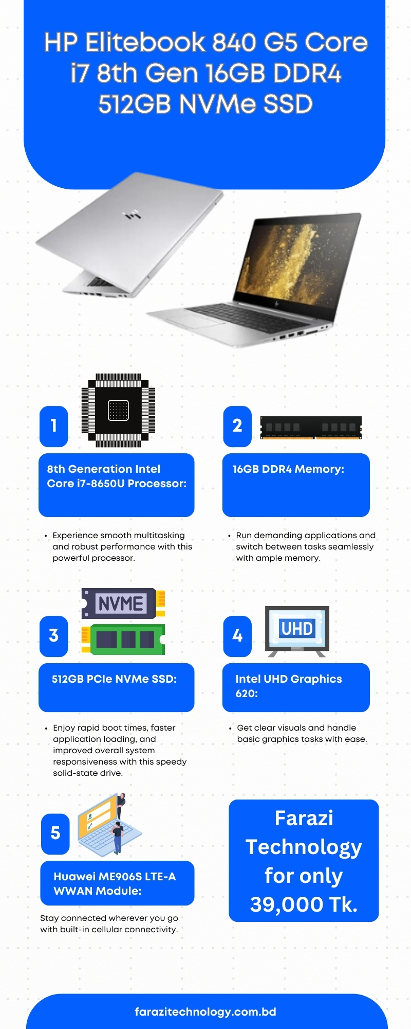 Looking for a powerful and versatile laptop in Bangladesh? Look no further than the HP EliteBook 840 G5 Core i7 8th Gen, available at Farazi Technology for only 39,000 Tk. This business-oriented laptop is packed with features to help you get the job done efficiently. We understand that affordability is important, and we strive to provide our customers with the best value for their money. You can Buy this Phone in Our Shop with EMI Facility. If you want, you can visit us directly to see the laptop and check and buy it. We offer a wide variety of laptops, computers, and other electronics to suit your needs and budget. Also if you want to order online then visit our Farazi Technology and confirm your order. We can deliver this laptop to you by home delivery.